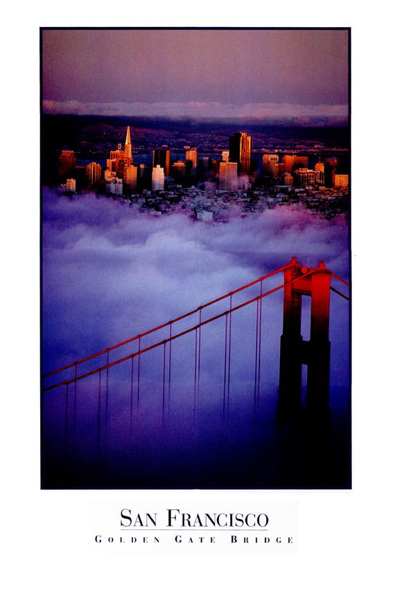 Easily our most popular image of San Francisco, this poster captures the subtle color variations of the original image: the soft pastel blues and magentas of the clouds, the deep rich red of the bridge, and the yellow flash of sun reflected off the buildings.